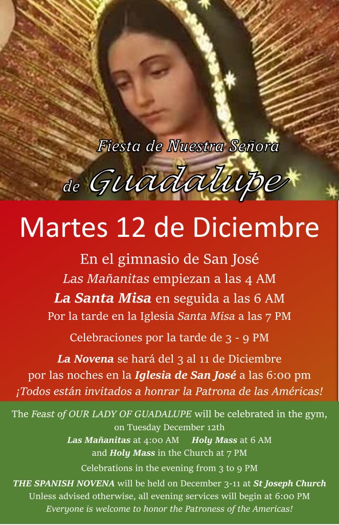 Our Lady of Guadalupe Day is Tuesday, December 12, 2023. Our schedule is as follow: