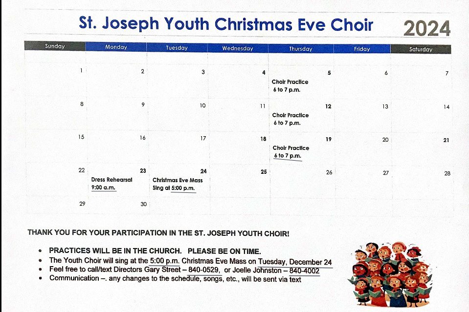 Estos ensayos son para la misa de Nochebuena en inglés que tendrá lugar el martes 24 de diciembre a las 5:00 p. m. Mirar la foto para las fechas de los ensayos.